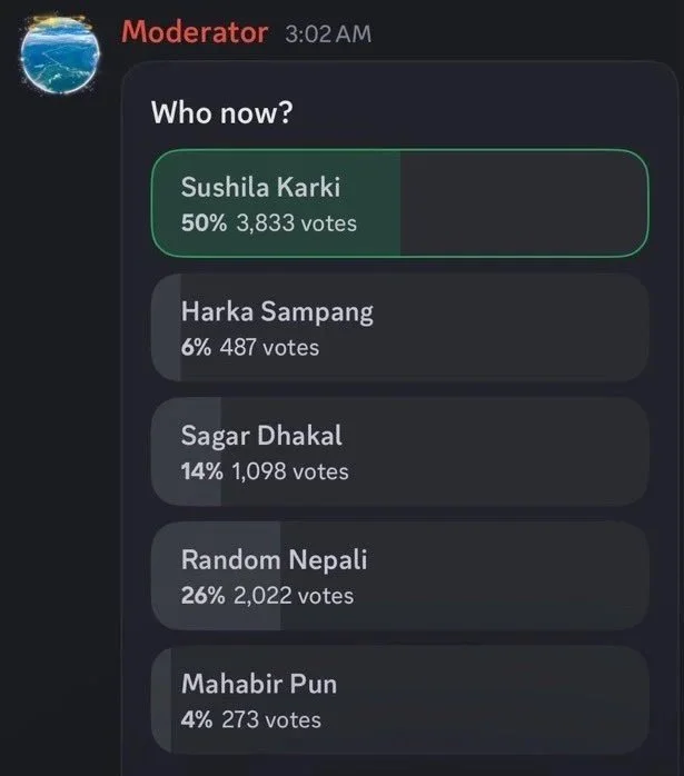 An X post shows Karki won the unofficial poll held by Nepali users on Discord to indicate their preferences for the new prime minister after Oli resigned. This shows the impact of civilians leveraging social media to their advantage.