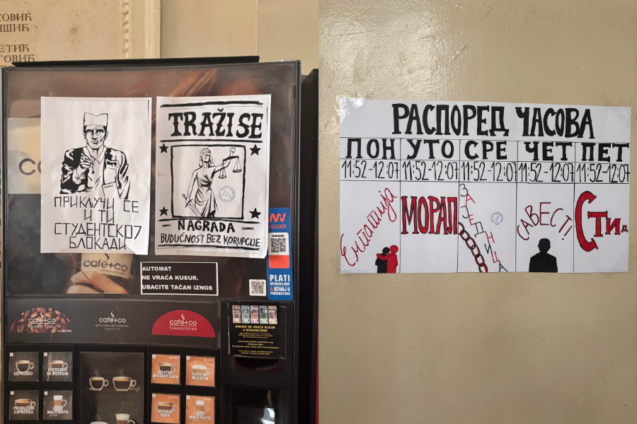 In January 2025, a counter-protest movement arose in response to the educational blockade. This group set up tents in front of the President’s Office and National Assembly, under the guise of students supporting the re-opening of schools. Independent investigative efforts revealed that Vucic’s administration was paying these protesters, and they were not in fact students at all. This group of fake students became known as “ćaci,” after a now infamous piece of graffiti misspelled “đaci” (meaning students in serbian) as ćaci. After the backlash, the “students” set up camp in front of the parliament building in white tents and have remained there since, accommodated by a catering service hired by the President. This place, known as Ćaciland, has continued to be used as a weapon against the protest movement.