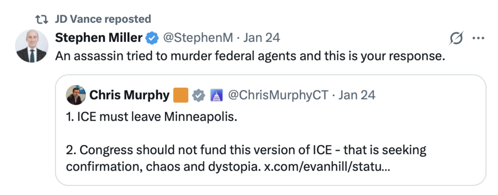 Vice President JD Vance retweets U.S. Homeland Security Advisor Stephen Miller's tweet calling Alex Pretti an “assassin.” Miller has repeatedly been one of the biggest voices behind the current administration's immigration policy.