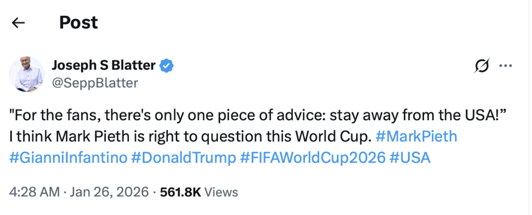 In addition to Göttlich, former FIFA president Sepp Blatter has also publicly announced his support for a proposed boycott. In a post from Mark Pieth, former Chair of the Independent Governance Committee's oversight of FIFA, Pieth stated: “Stay away from the USA! You’ll see it better on TV anyway. And upon arrival, fans should expect that if they don’t please the officials, they’ll be put straight on the next flight home. If they’re lucky.” Blatter, clearly agreeing with this shot at Trump’s immigration policy, quoted the interview adding “I think Mark Pieth is right to question this World Cup.”