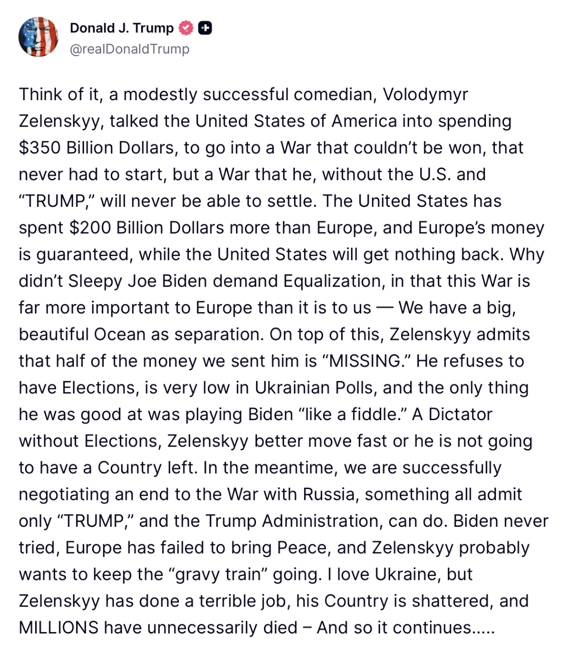 Trump, in a Truth Social post, accuses Zelenskyy of being a dictator without elections on February 19, 2025. Ukraine has suspended its elections since 2022, following the imposition of martial law by President Zelenskyy and its approval by the Ukrainian Parliament.