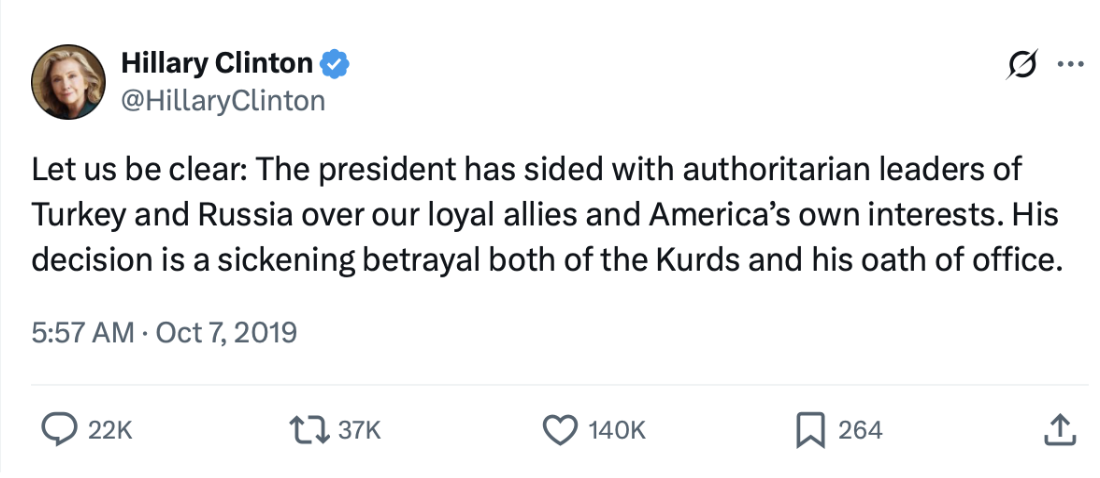 On X (formerly Twitter), Clinton responded to Trump’s troop withdrawal from Syria, which she described as a “sickening betrayal.”