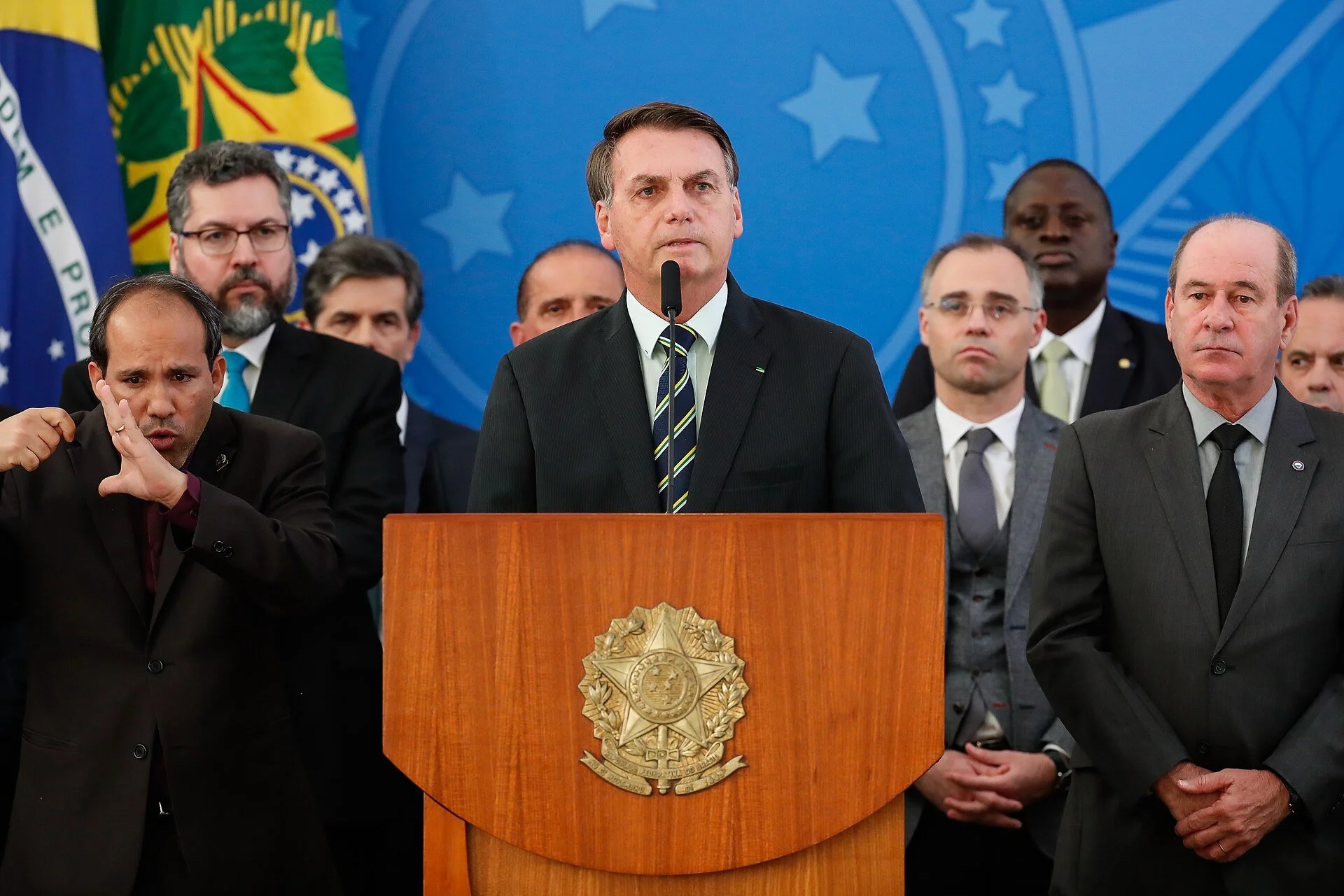 President Bolsonaro at a press conference. During his presidency, Bolsonaro frequently pursued policies that criminalized the work of environmental defenders